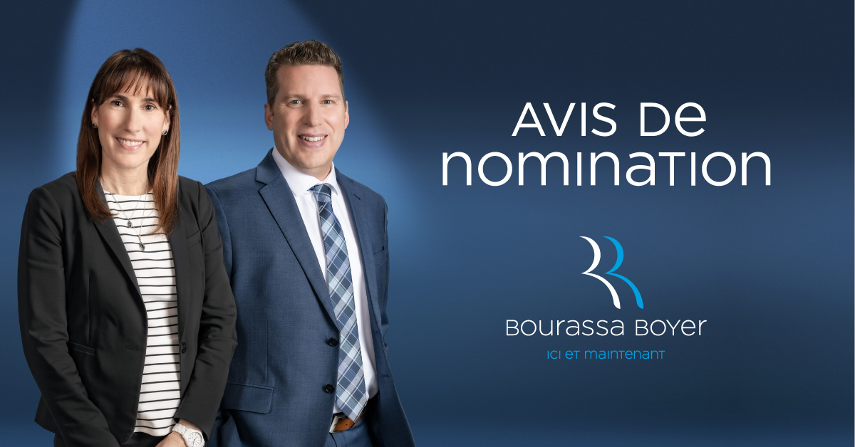 Par ces nominations, BOURASSA BOYER réaffirme sa volonté de valoriser l’expertise interne, d’assurer une relève solide et de poursuivre son développement au bénéfice de sa clientèle et de la collectivité.